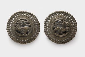A pair of circular ornaments for a belt, each with a mythological beast in the centre 18th-19th century