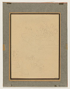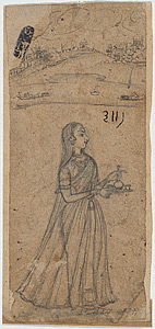 A woman carrying a tray, a lake with boats and a town in the distance 18th century