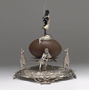Inkwell with mounted emu egg and Aboriginal figures c.1870